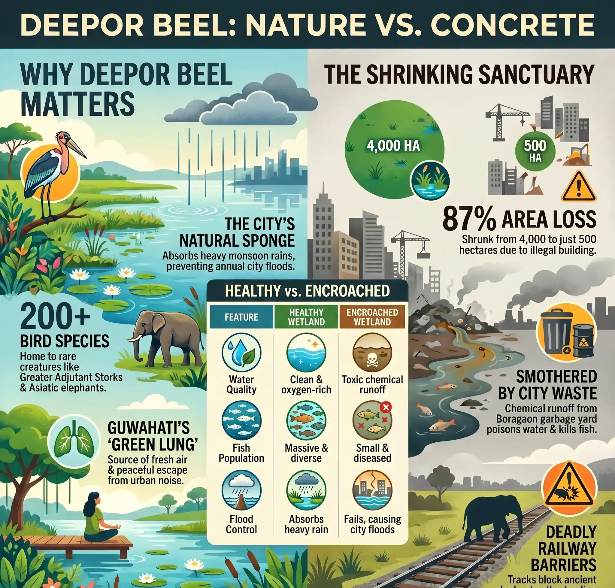 Just a few miles away from the busy streets of Guwahati lies a beautiful mirror of water known as Deepor Beel. This massive freshwater lake is a true paradise for nature lovers and a safe home for hundreds of rare birds and wild elephants. However the beauty of this natural wonder is slowly fading. The growing city is pushing closer and closer to the water every single day. This rapid growth known as Deepor Beel urban encroachment is choking the lake with garbage and concrete buildings. By understanding the struggles of this precious wetland we can learn how important it is to protect our natural spaces before they disappear completely under modern city lights.| Feature | Details |