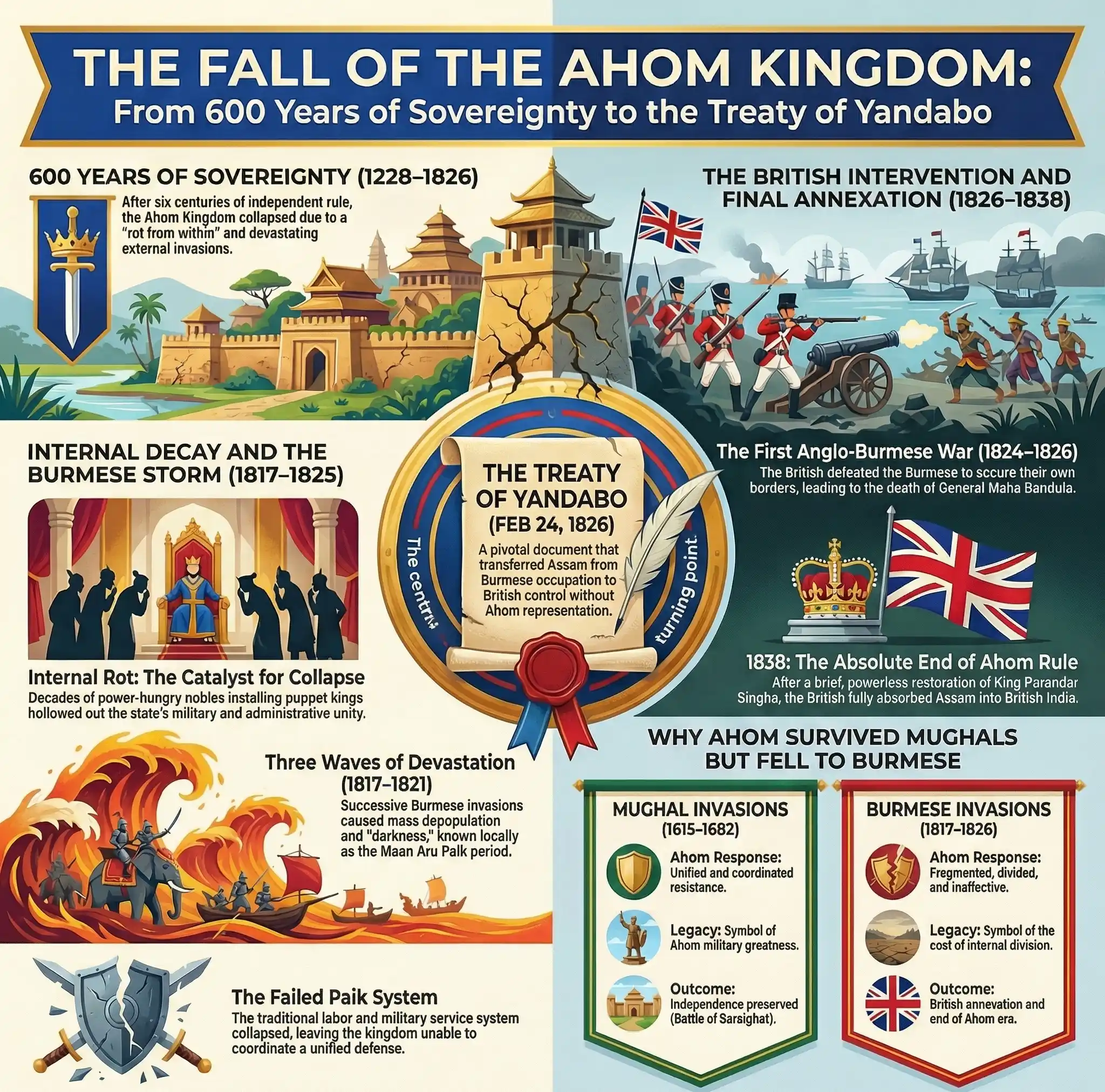 For Assam, the treaty meant that the Burmese occupation was over. But it did not mean freedom. The treaty did not restore the Ahom Kingdom. It transferred Assam from Burmese occupation to British control. The document that ended one foreign invasion simply confirmed the beginning of another.