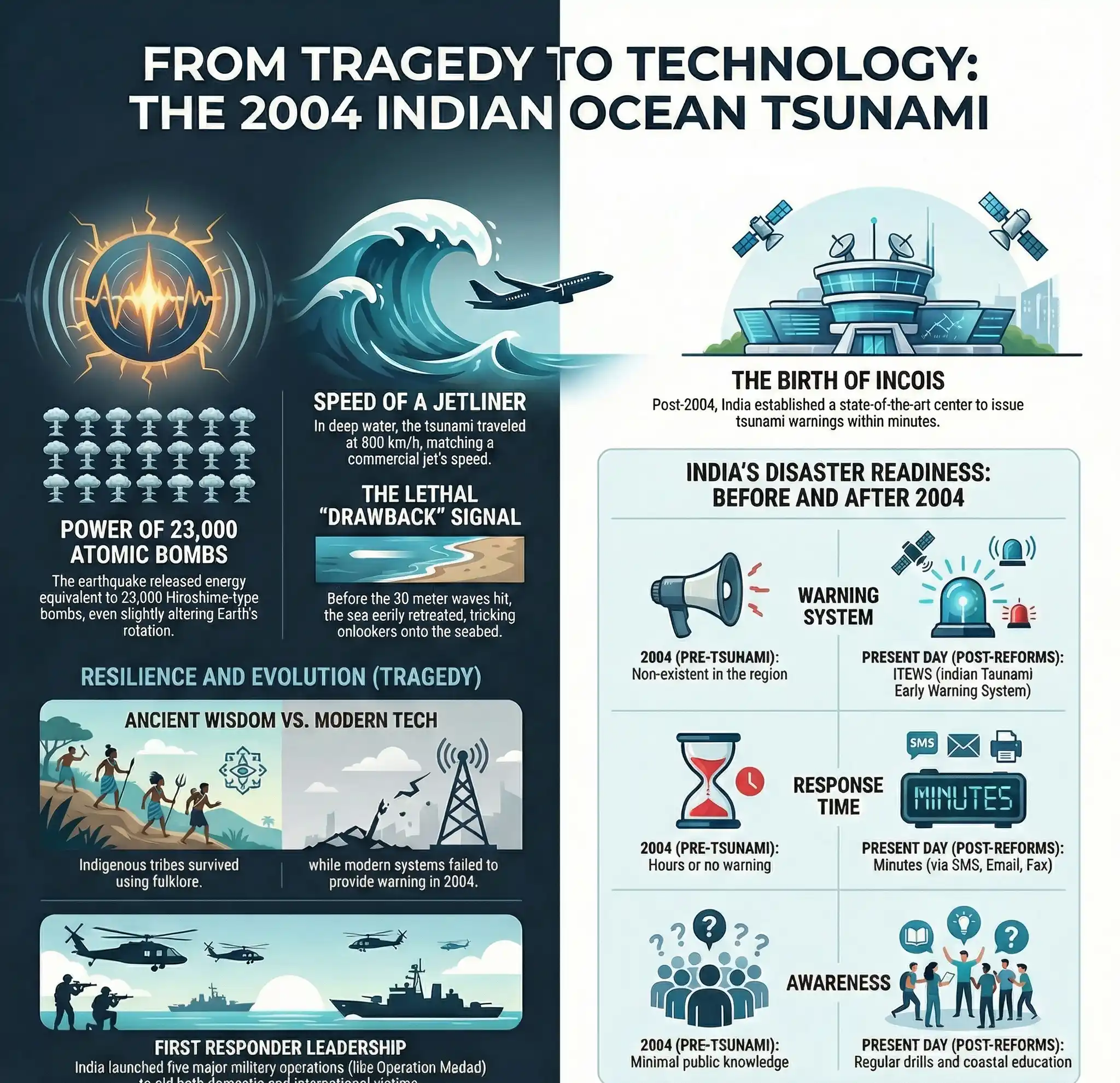 The 2004 Indian Ocean Tsunami was a watershed moment in global history. Triggered by a massive 9.1–9.3 magnitude earthquake off the coast of Sumatra, it caught the world off-guard, claiming over 227,000 lives across 14 countries. For India, it was a tragedy that struck the southern coast and the Andaman & Nicobar Islands with brutal force. However, it also marked the beginning of a new era in disaster preparedness, leading to the creation of advanced warning systems like INCOIS. This article explores the timeline, the devastating impact, and the incredible human spirit that rose from the debris.| Feature | Details |