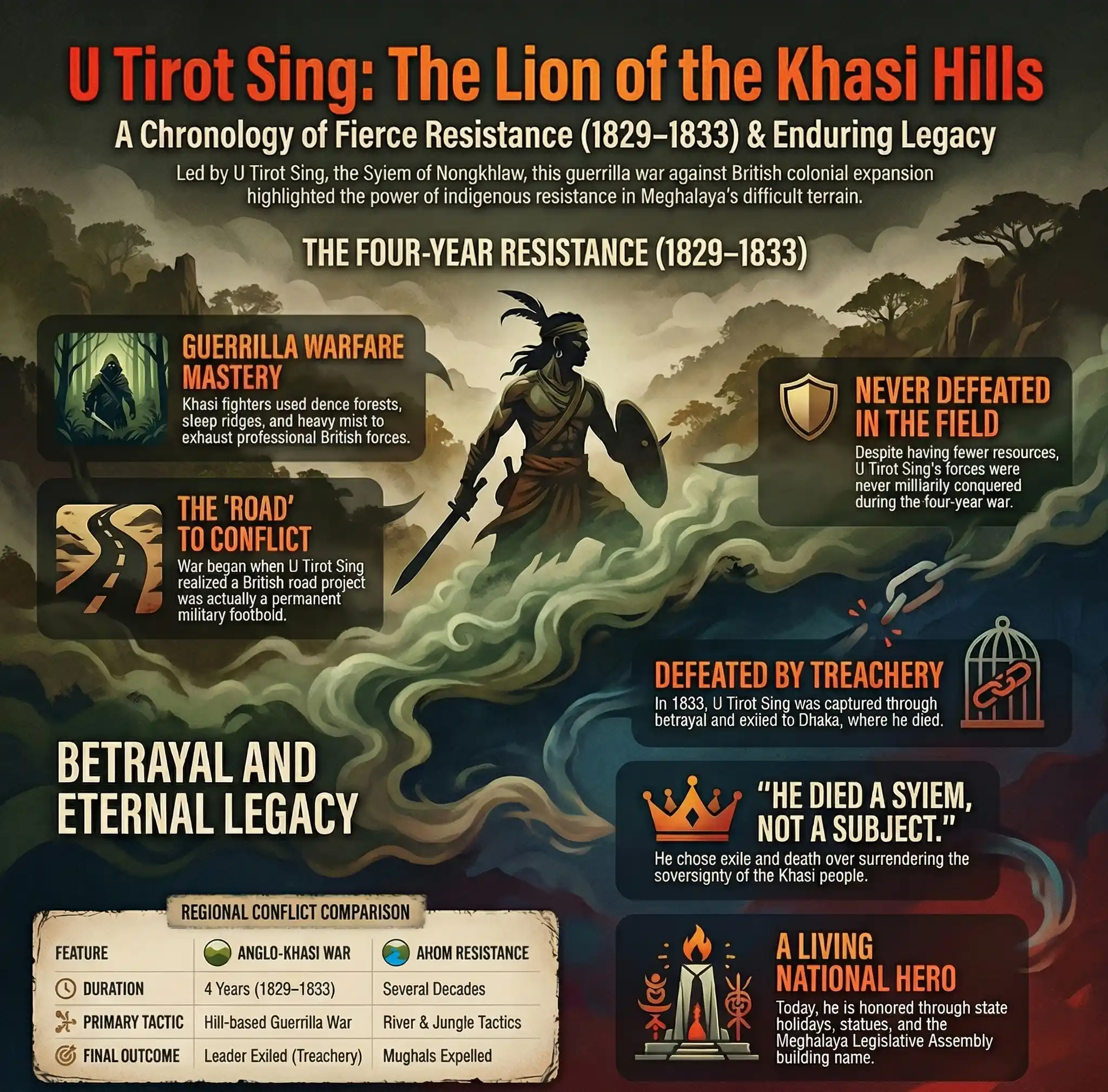 In 1829 CE, the British East India Company proposed building a road through the Khasi hills of what is now Meghalaya, connecting their territories in Assam to the plains of Bengal. The Syiem, or chief, of Nongkhlaw, a man named U Tirot Sing, agreed to the proposal but very quickly realised that the British were not simply building a road. They were building a presence, a permanent foothold in sovereign Khasi territory. He withdrew his cooperation and launched a guerrilla resistance that tied down British forces in the Khasi hills for four years. His fighters used the dense forest, the steep ridges, and the mist of the Khasi plateau to make the British pay dearly for every step they took. Betrayed and captured in 1833 CE, U Tirot Sing was exiled to Dhaka, where he died in 1835 CE without ever seeing his hills again. He was never defeated in the field. He was defeated by treachery. And because of that, his name has never left the memory of the Khasi people or the wider story of India's resistance to colonial rule.| Detail | Information |