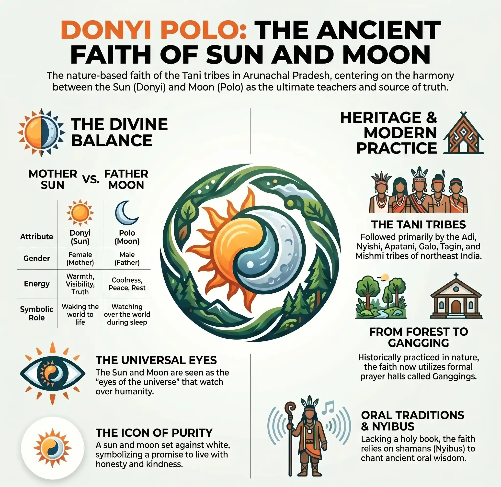 The Donyi Polo faith is a beautiful and ancient way of life followed by the Tani tribes of Arunachal Pradesh. Instead of looking for answers in statues or distant places, the followers of this faith look up at the sky. They believe the Sun, called Donyi, and the Moon, called Polo, are the ultimate sources of truth and life. Donyi represents the warm, caring energy of a mother, while Polo brings the calm, cool guidance of a father. Together, they watch over the world, making sure people live with honesty and kindness. Today, this indigenous belief system has grown from quiet village prayers into a recognized religion with community prayer halls, helping the local people keep their ancient culture alive in the modern world.| Feature | Details |